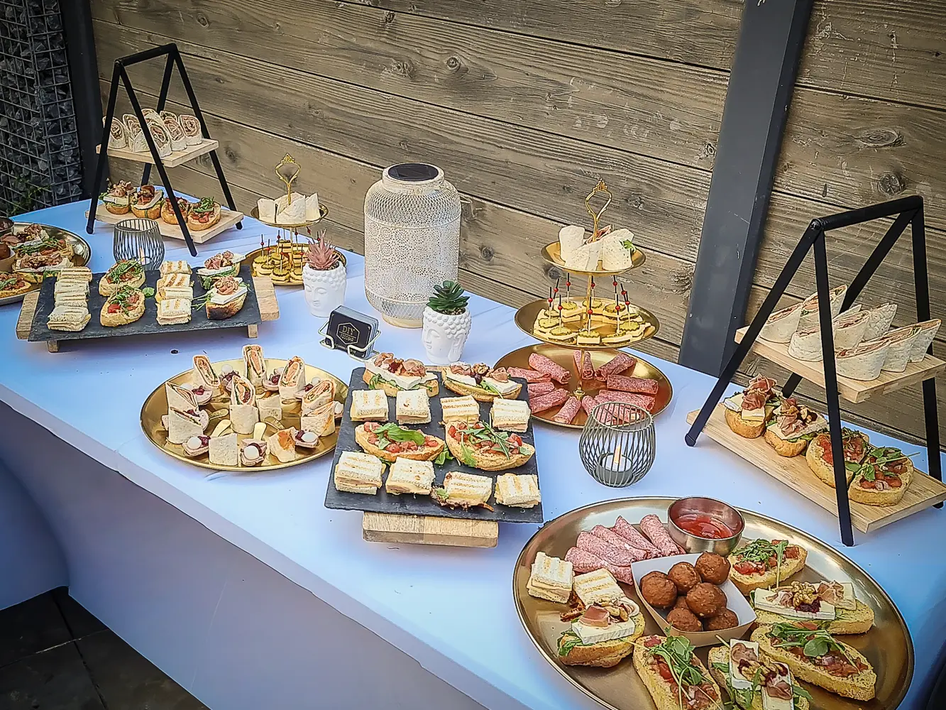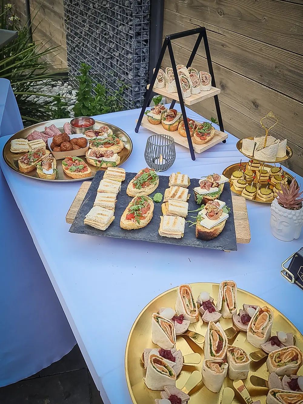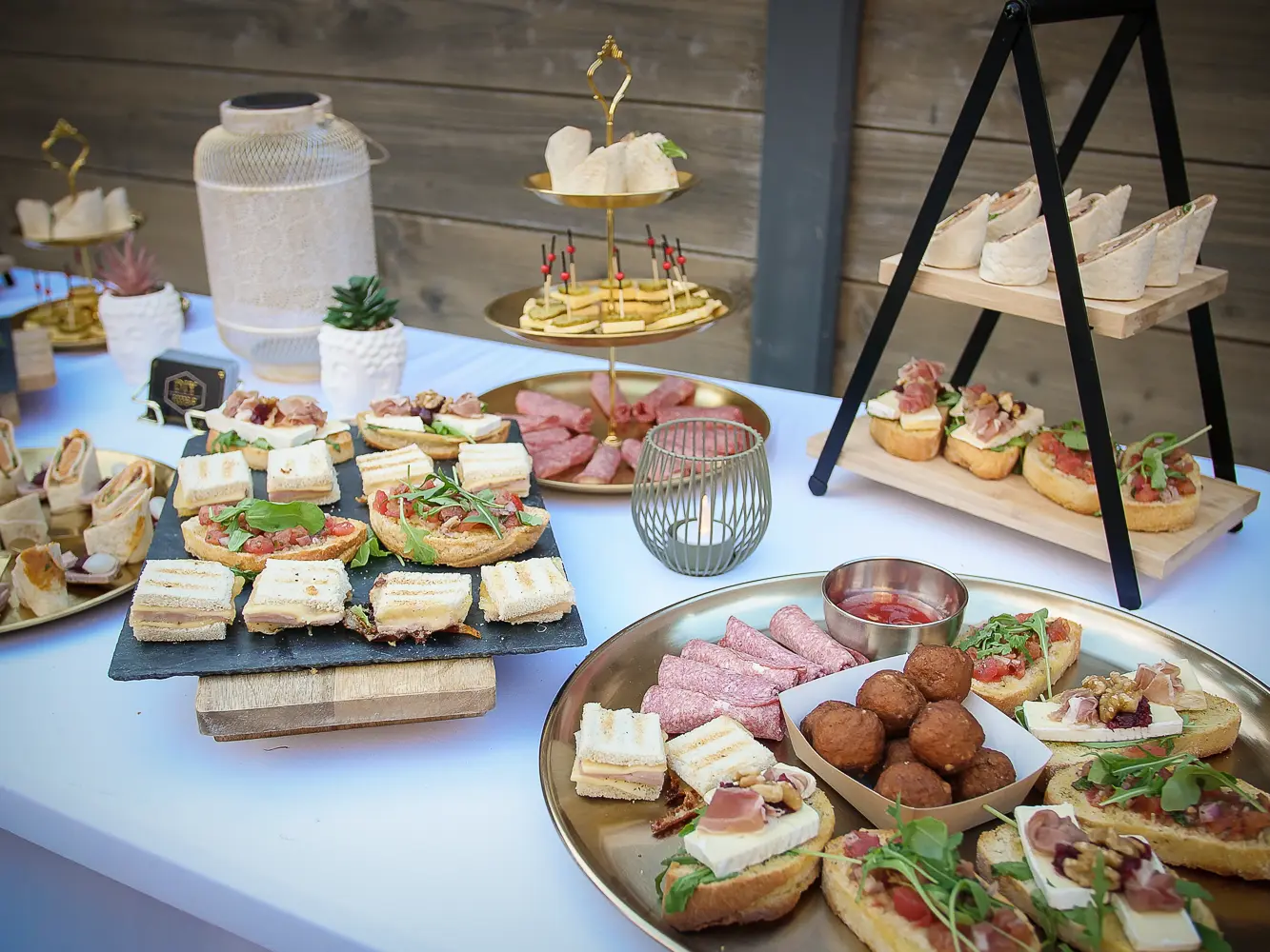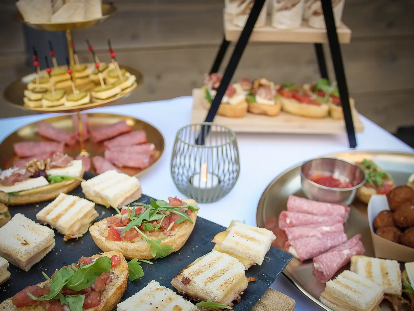 knoflook garnalen - kaas roggebrood snack - caprése stokje - crostini tomaten bruschetta - crostini vitello tonnato - crostini brie parmaham - mini carpaccio - zalm cupje