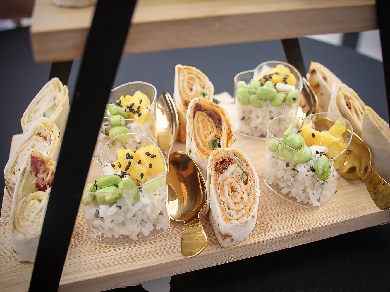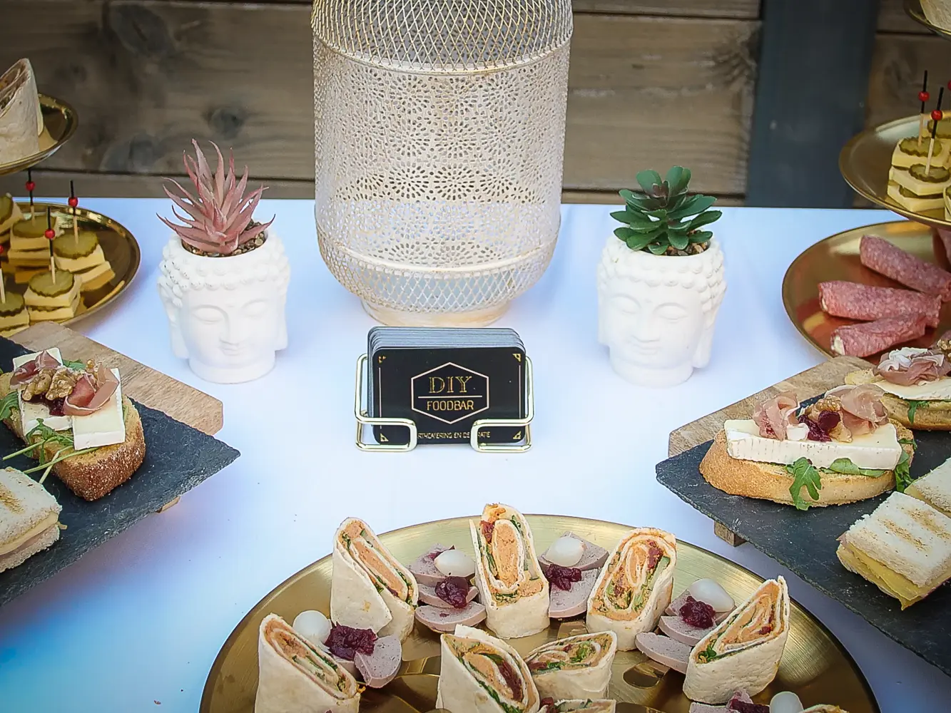 - mini sandwiches - wrap hapje hummus - wrap hapje tonijn - crostini tomaten bruschetta - crostini brie parmaham