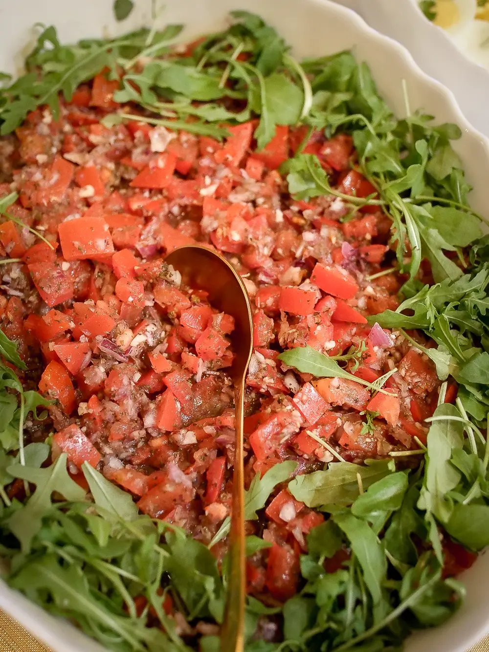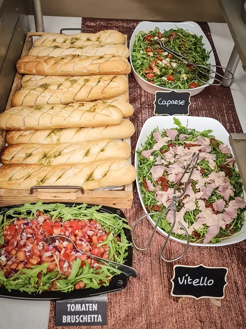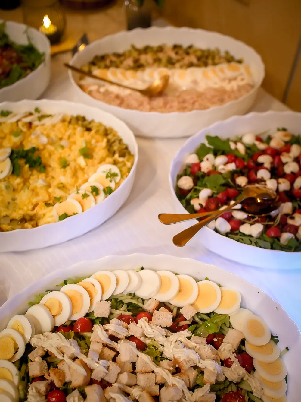 - Koude salades: koude schotel, aardappel-ei salade, boeren salade en tomaat-mozzarella-rucola salade.