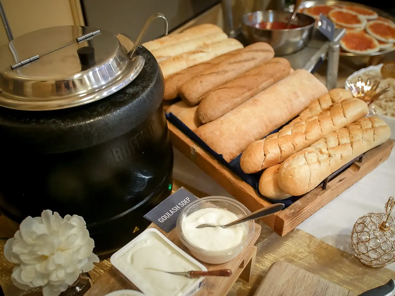 - De soepen worden geserveerd met brood, aioli, pesto en roomkaas kruiden smeersels.